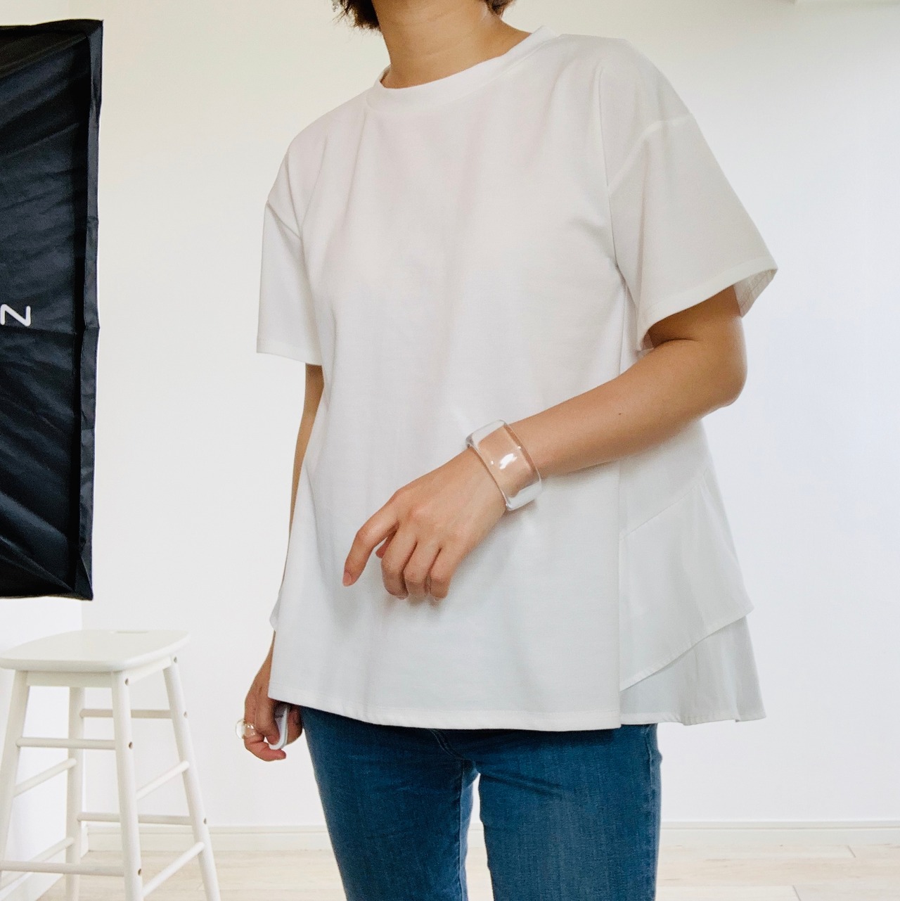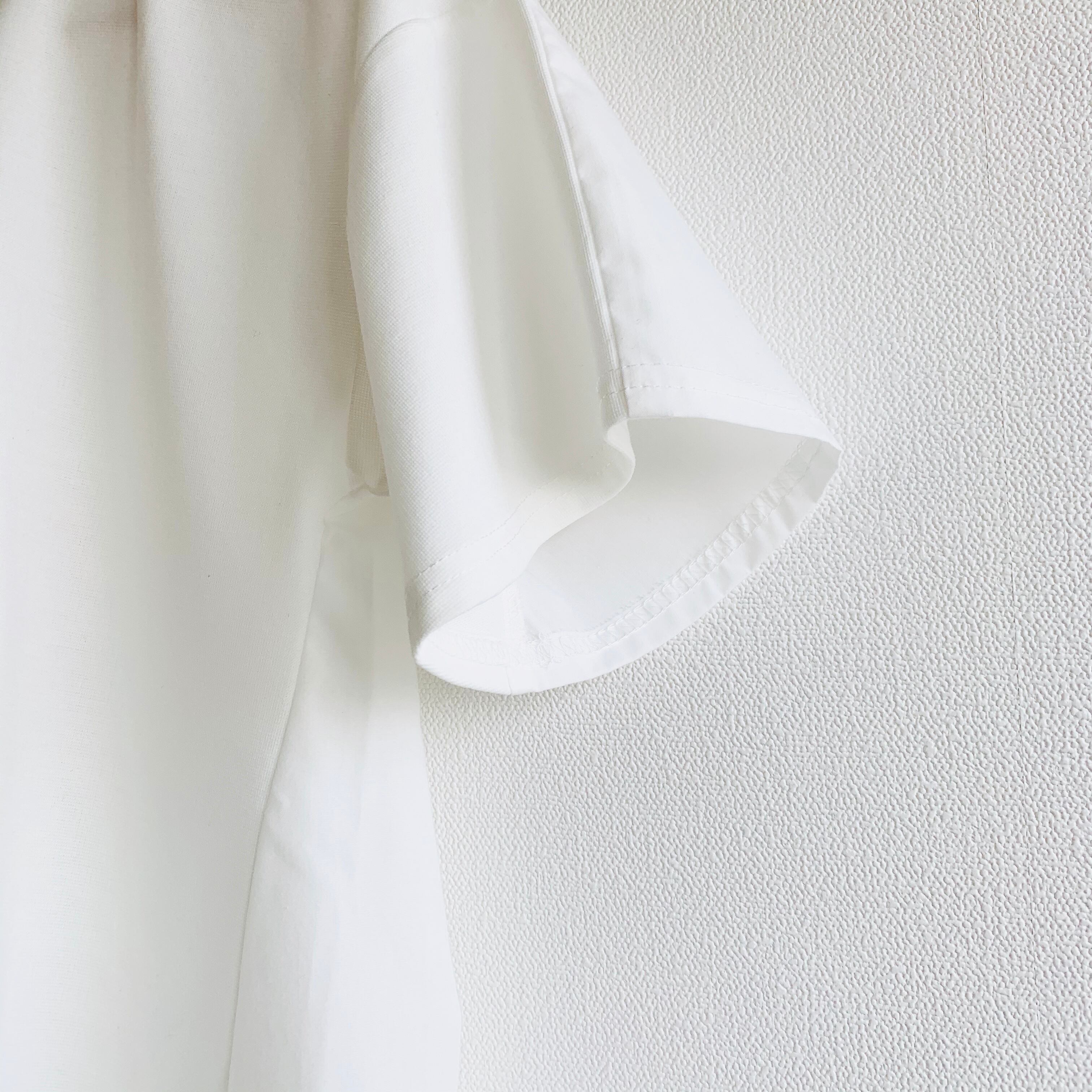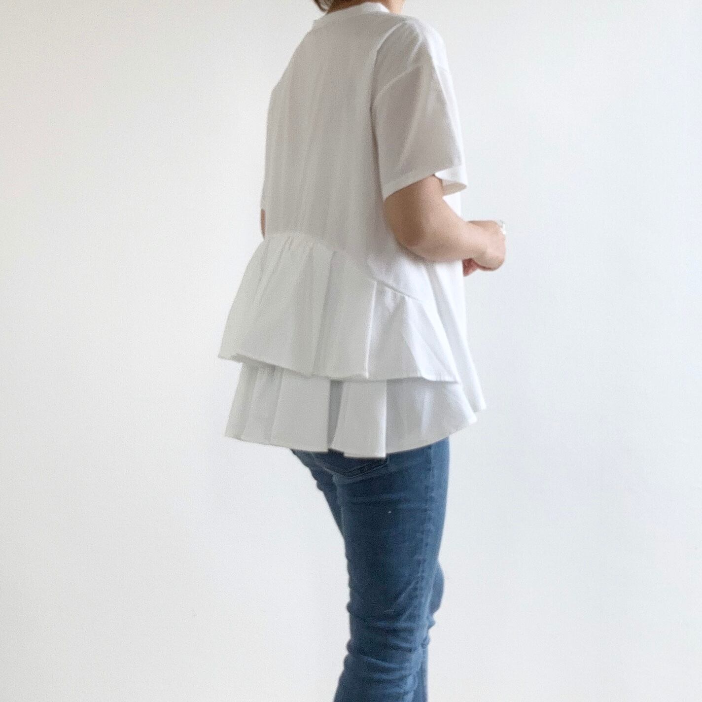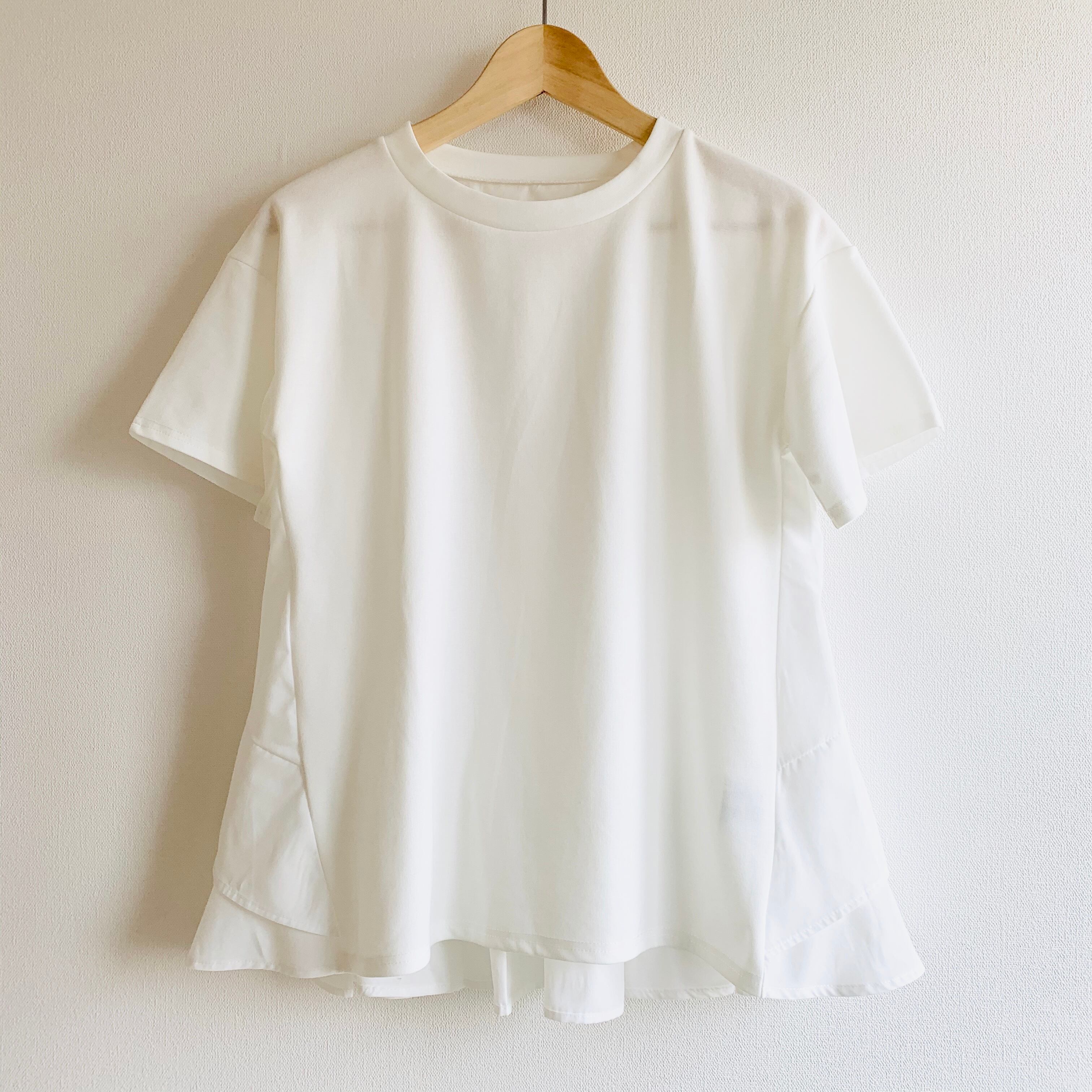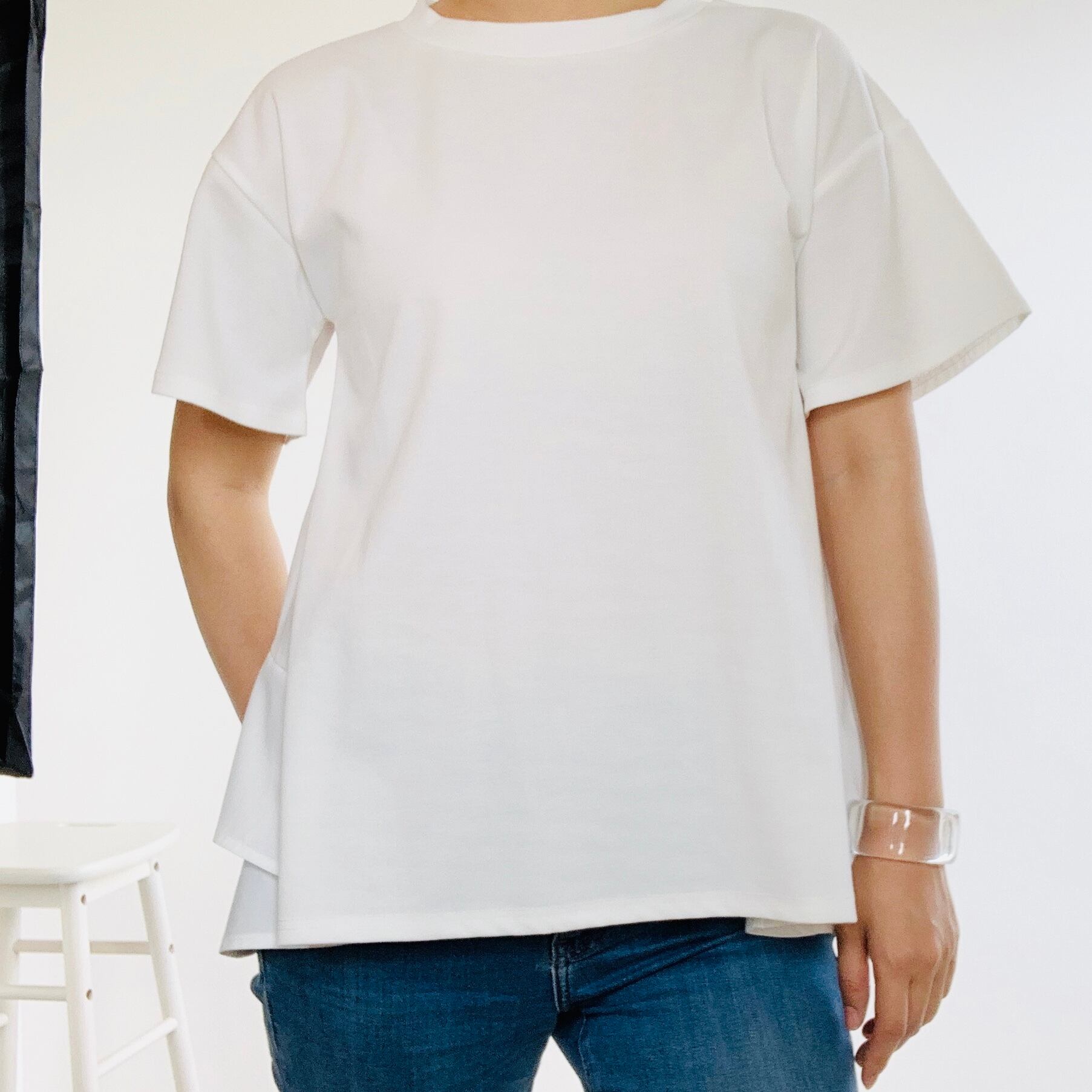 前見頃はカットソー素材、後ろ身頃がシャツ地、という切り替えが特徴。