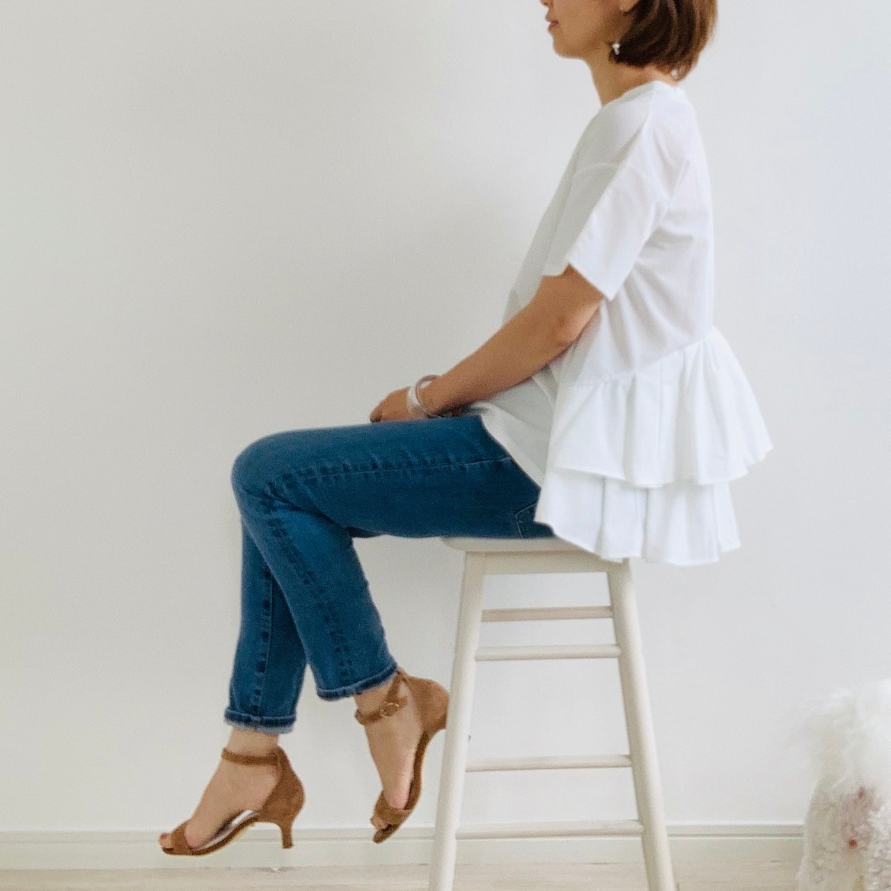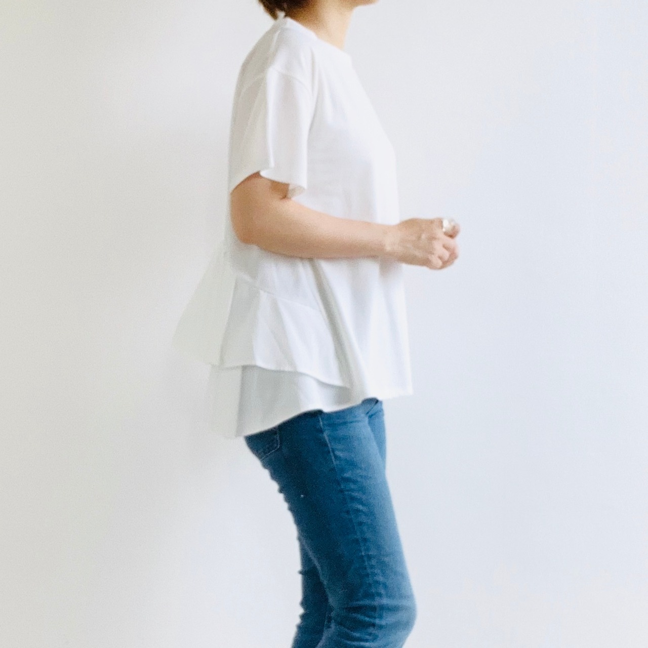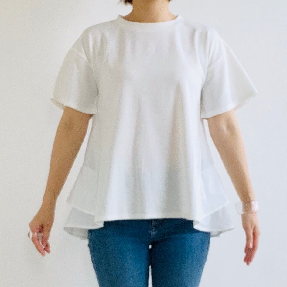 当店のバイヤー(写真のモデル)は、自身のお尻の大きさを気にしておりますが、お写真のとおり、ふわっと広がる後ろ身頃のデザインが見事にヒップをカバーし、上半身がふわっと広がった分、下半身(脚全体)をほっそりと見せる効果もあります。