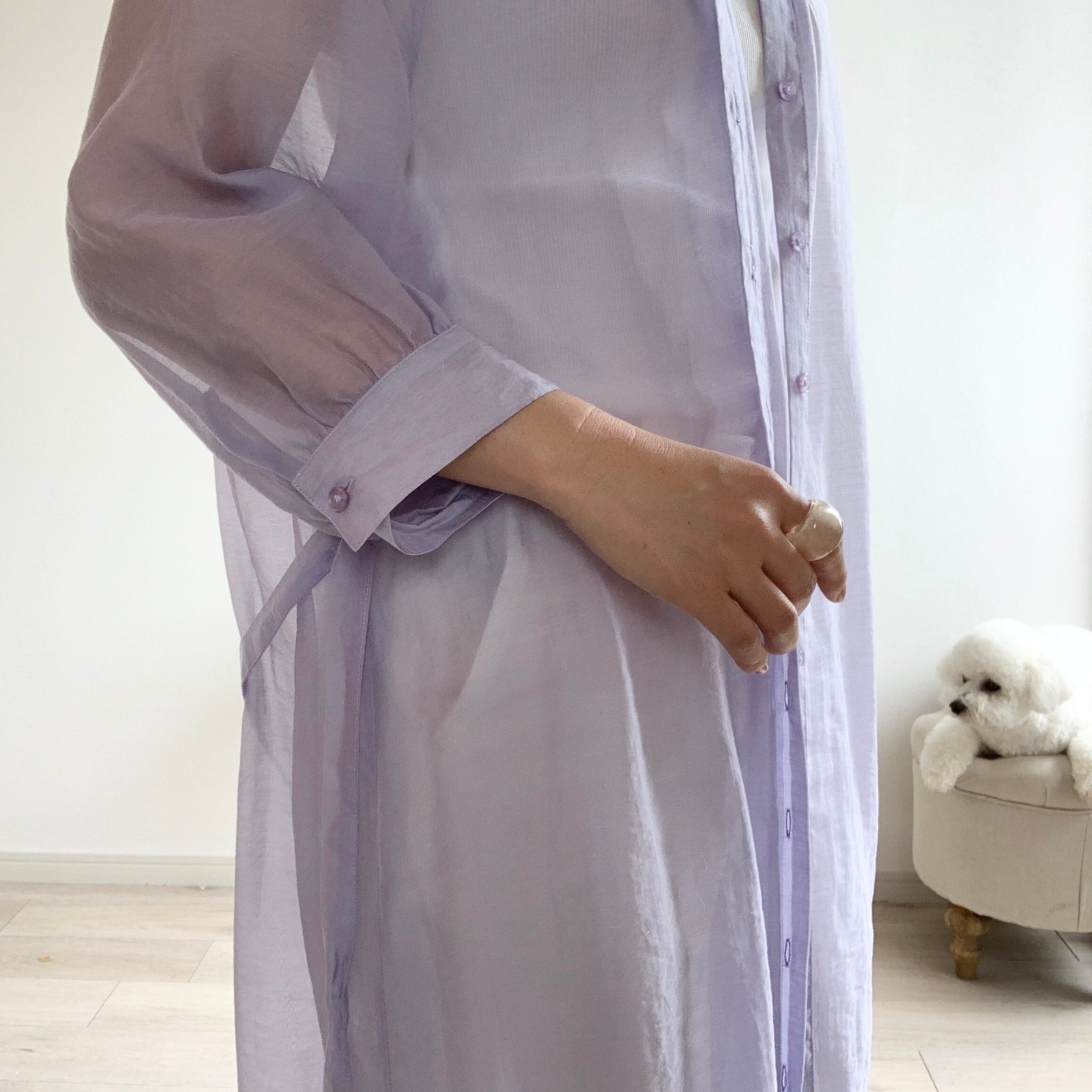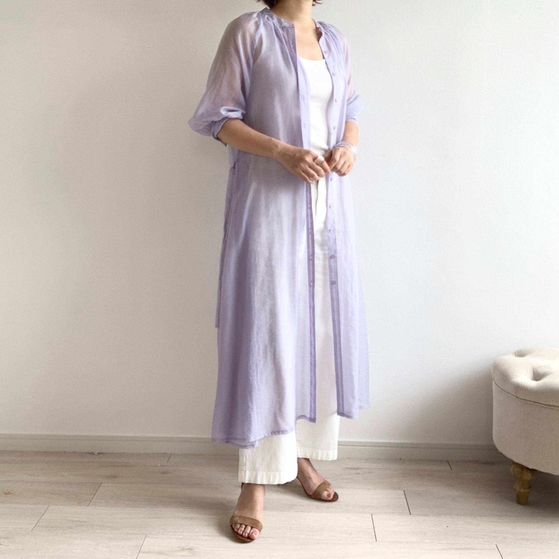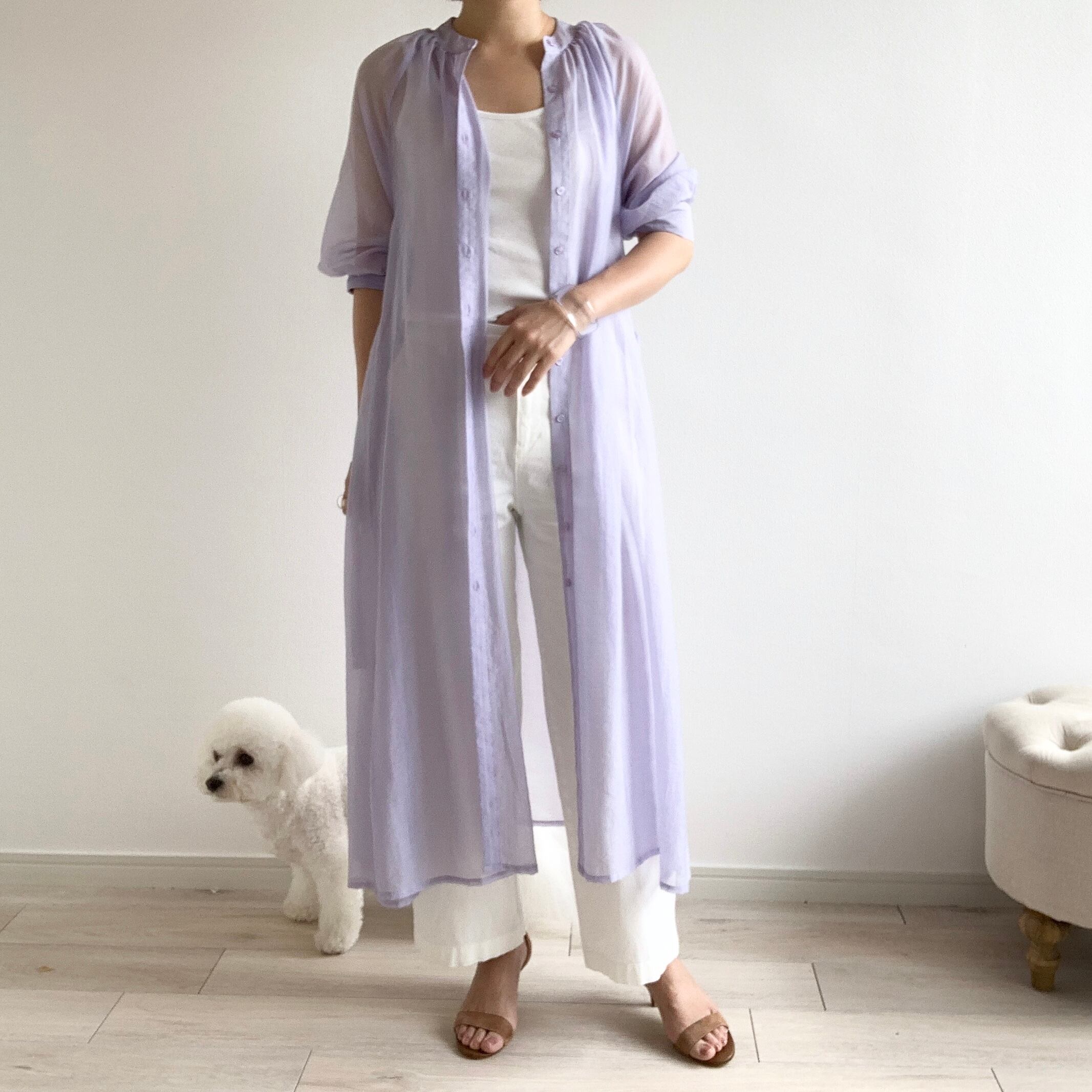 やさしい光沢のある柔らかい素材をたっぷりと使用した、これからの季節にぴったりのシアー感のある素材です。さっと羽織るだけでコーディネートが品良くまとめられ、またロング丈なので「大人の余裕」を漂わせる逸品です。軽くて優しく、紫外線や冷房からも守ってくれるロングブラウスは、1枚持っていると、お出かけ先を選ばずさっとコーディネートできます。