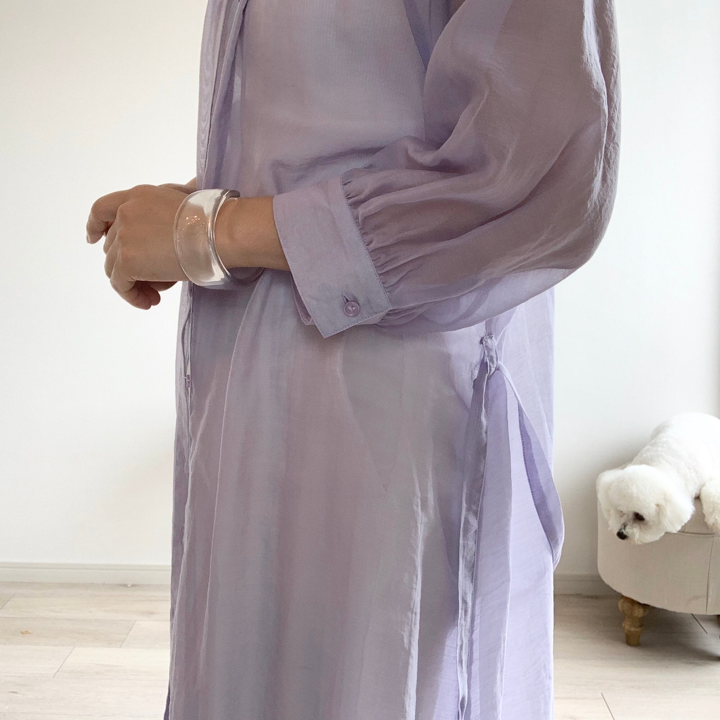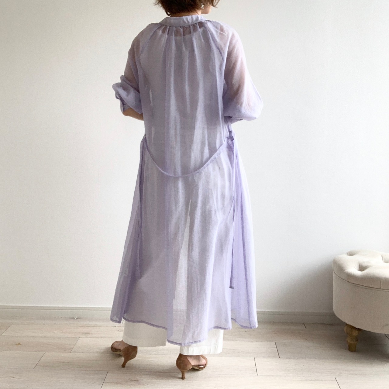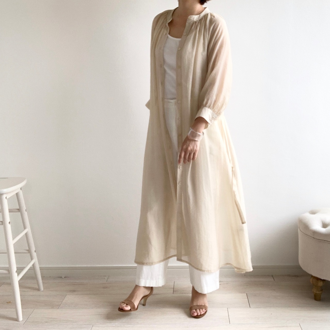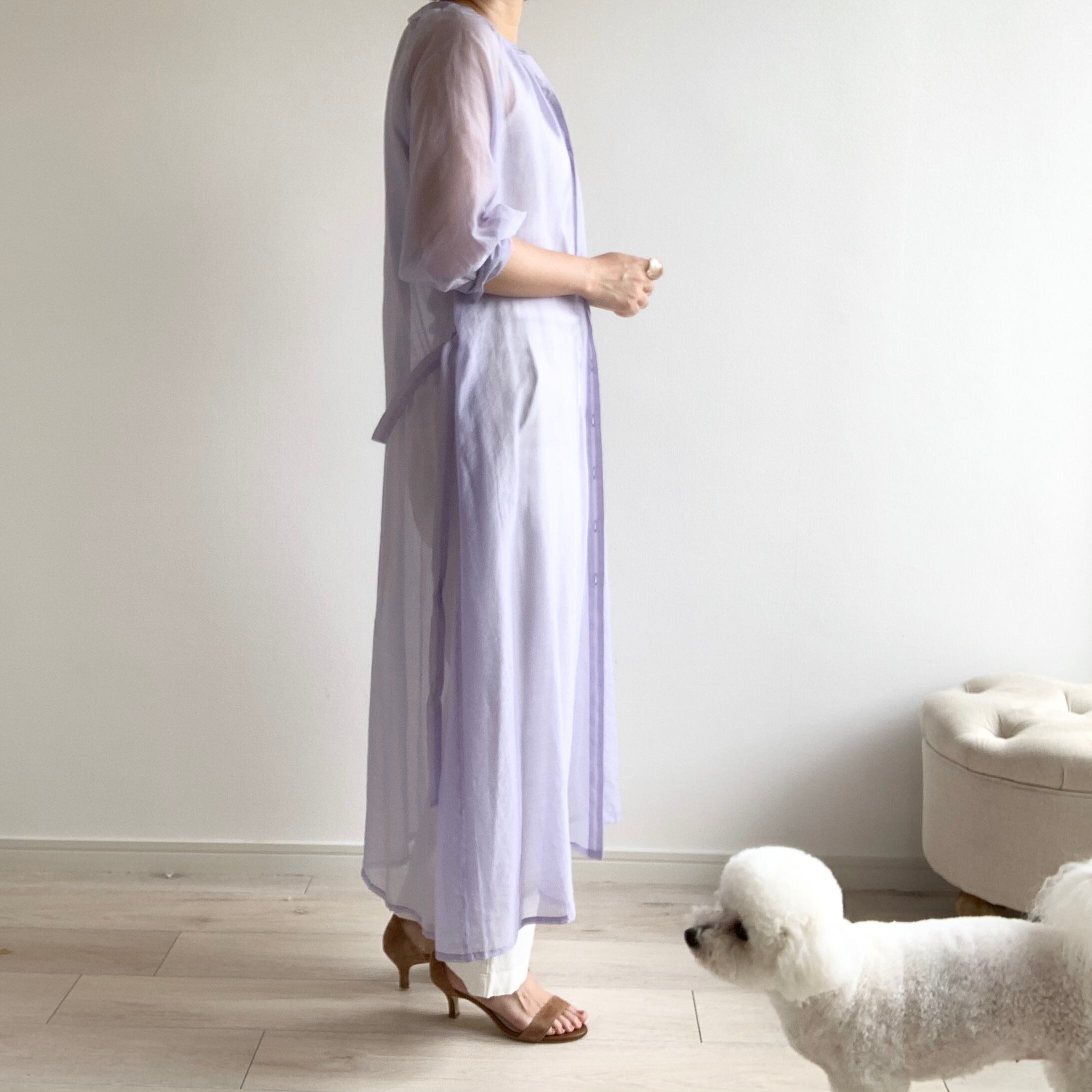 やさしい光沢のある柔らかい素材をたっぷりと使用した、これからの季節にぴったりのシアー感のある素材です。さっと羽織るだけでコーディネートが品良くまとめられ、またロング丈なので「大人の余裕」を漂わせる逸品です。軽くて優しく、紫外線や冷房からも守ってくれるロングブラウスは、1枚持っていると、お出かけ先を選ばずさっとコーディネートできます。