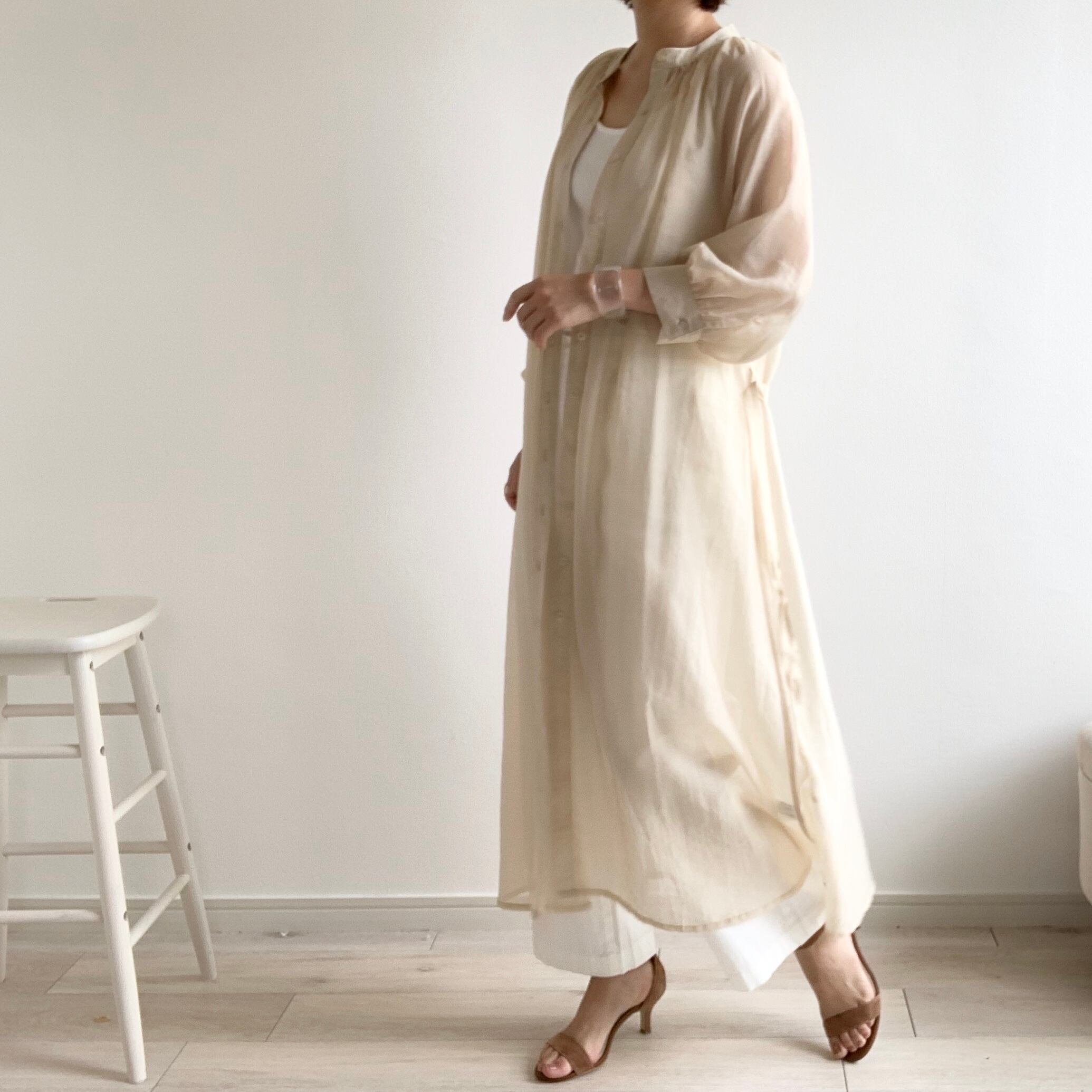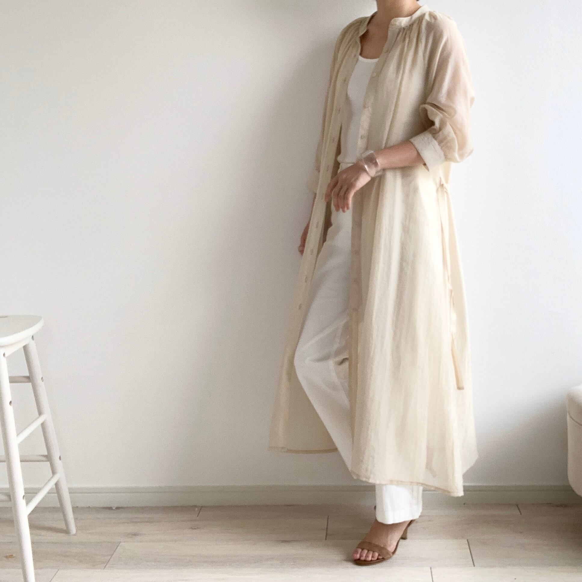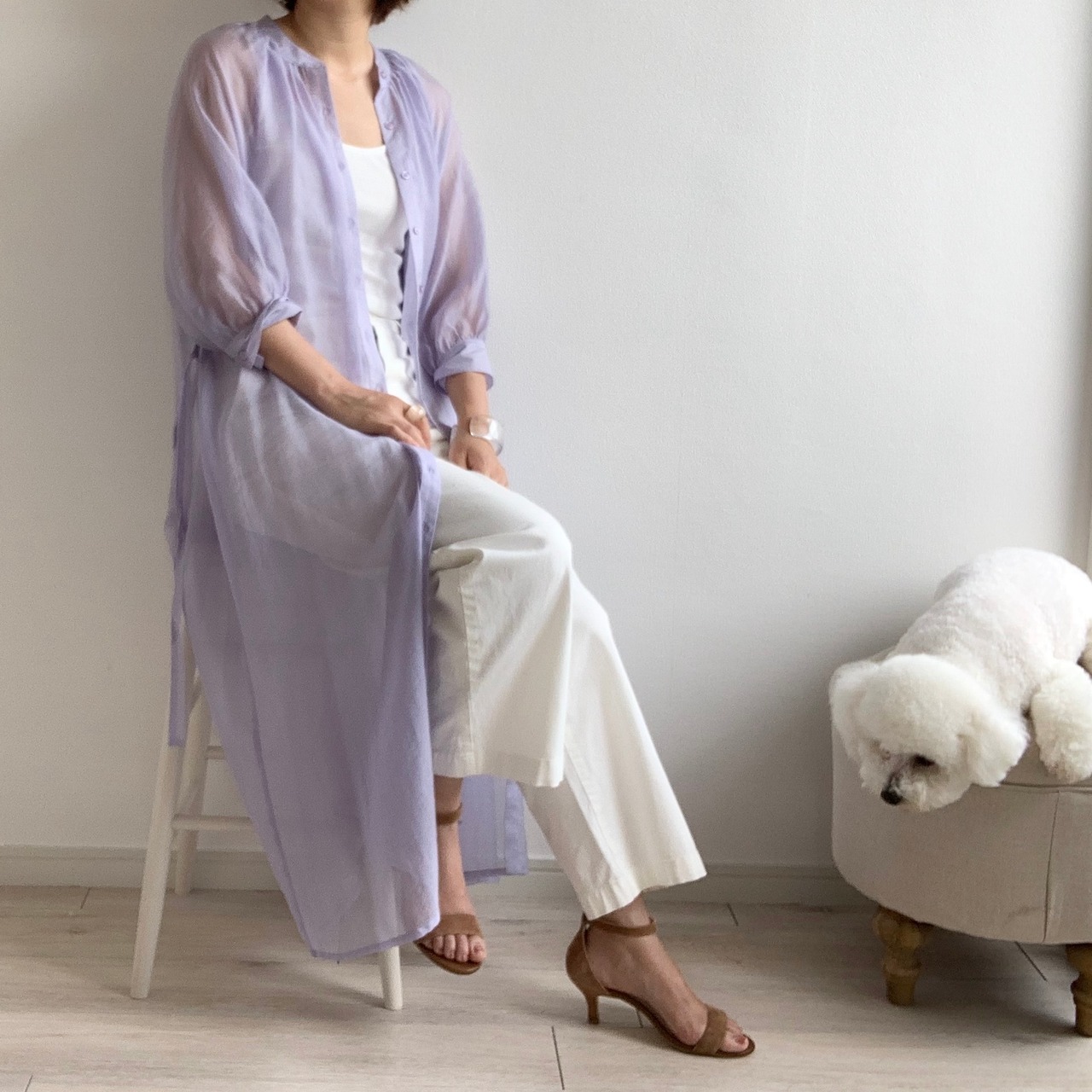 やさしい光沢のある柔らかい素材をたっぷりと使用した、これからの季節にぴったりのシアー感のある素材です。さっと羽織るだけでコーディネートが品良くまとめられ、またロング丈なので「大人の余裕」を漂わせる逸品です。軽くて優しく、紫外線や冷房からも守ってくれるロングブラウスは、1枚持っていると、お出かけ先を選ばずさっとコーディネートできます。