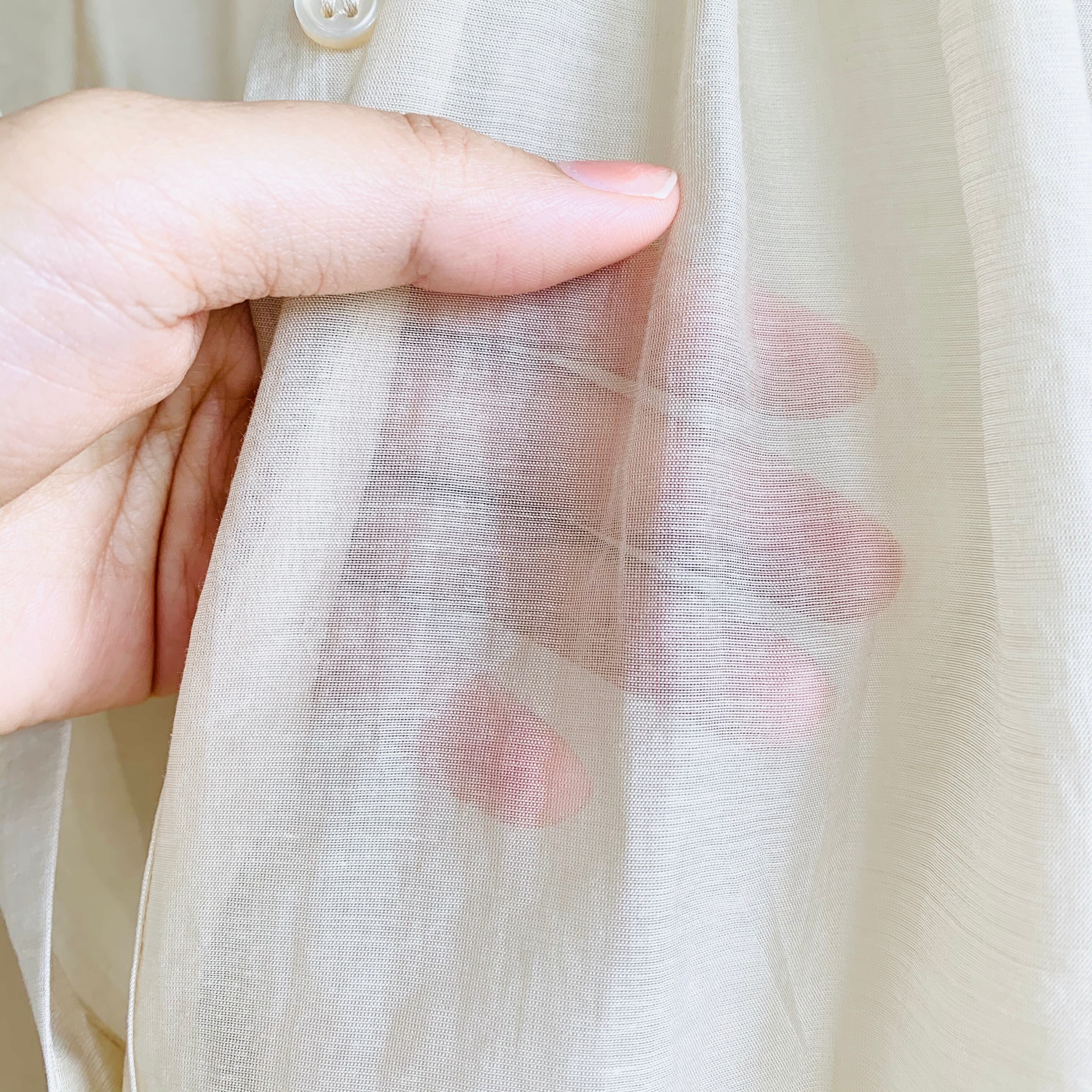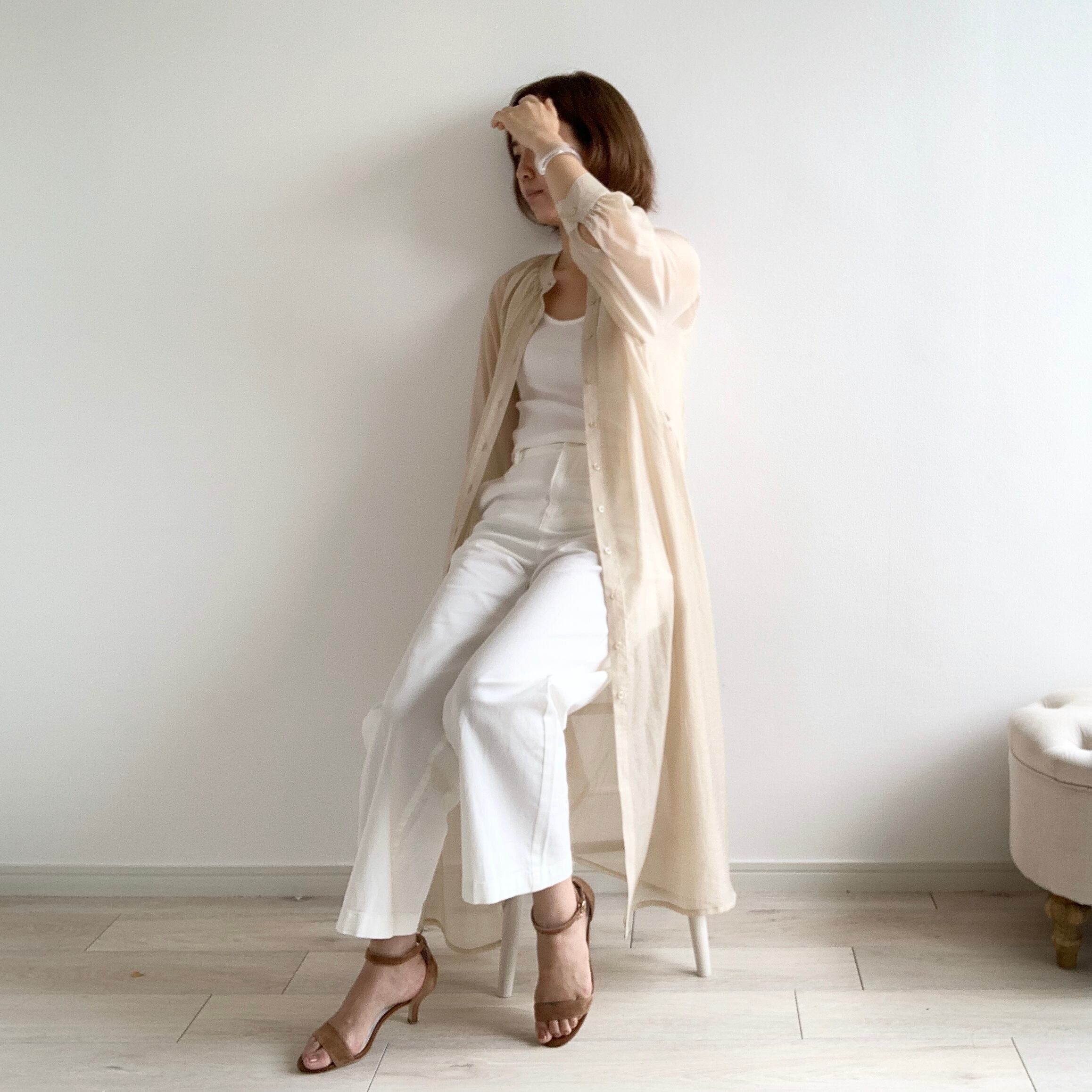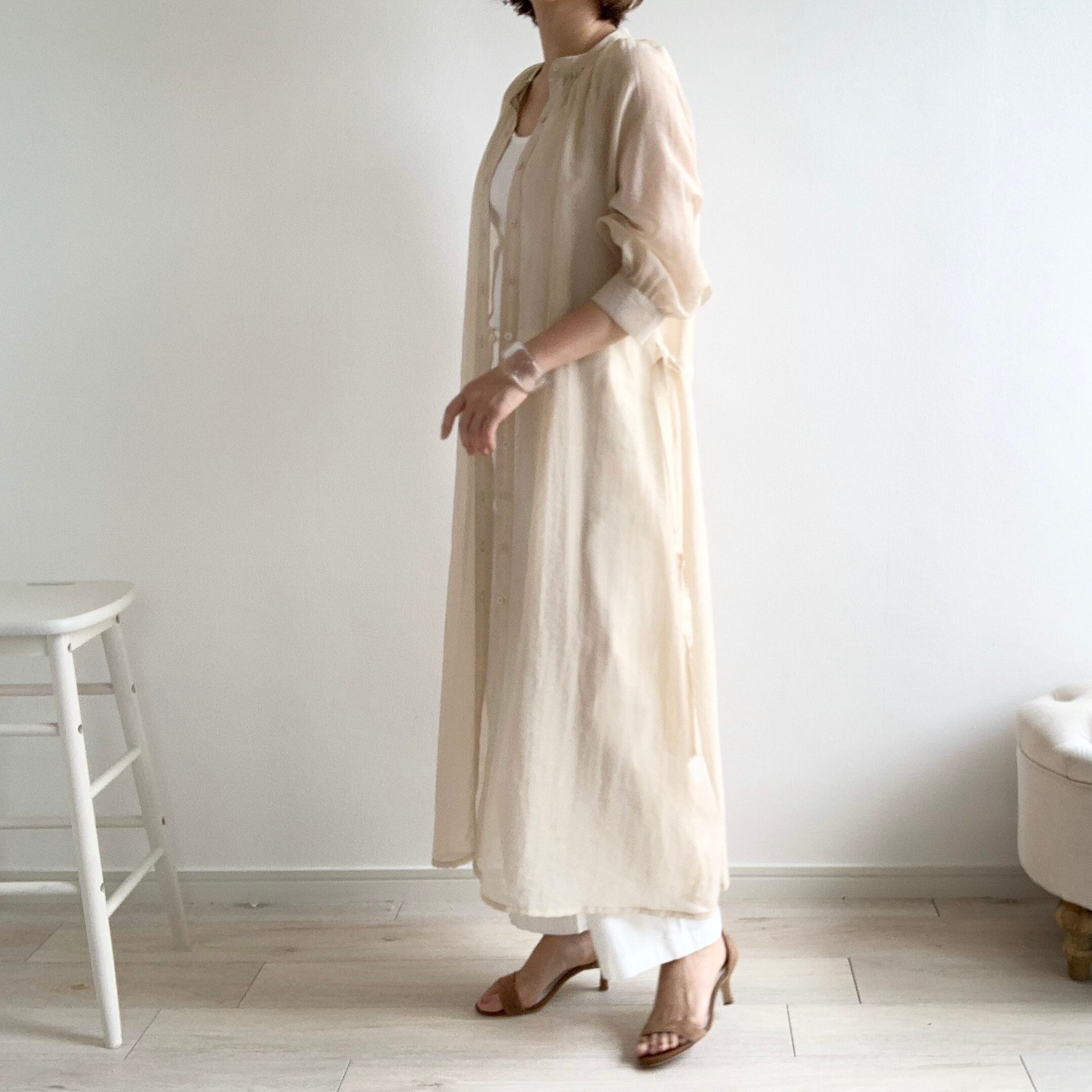 やさしい光沢のある柔らかい素材をたっぷりと使用した、これからの季節にぴったりのシアー感のある素材です。さっと羽織るだけでコーディネートが品良くまとめられ、またロング丈なので「大人の余裕」を漂わせる逸品です。軽くて優しく、紫外線や冷房からも守ってくれるロングブラウスは、1枚持っていると、お出かけ先を選ばずさっとコーディネートできます。
