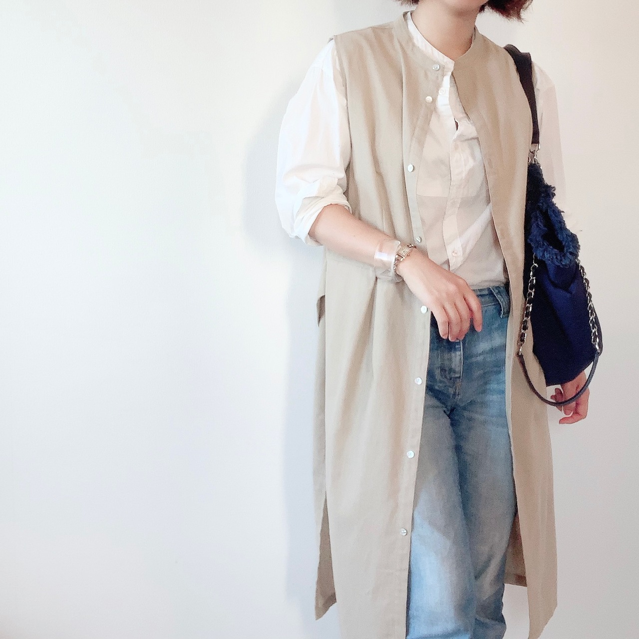 夏は薄着になるため体のラインが出やすい季節ですが、このサラリと軽いジレを1枚羽織るだけで、きちんと感もプラスでき、お仕事スタイルにもOK。デニムでスニーカーを合わせれば、ご近所スタイルにもと、万能すぎる、優秀すぎるセットアップです。