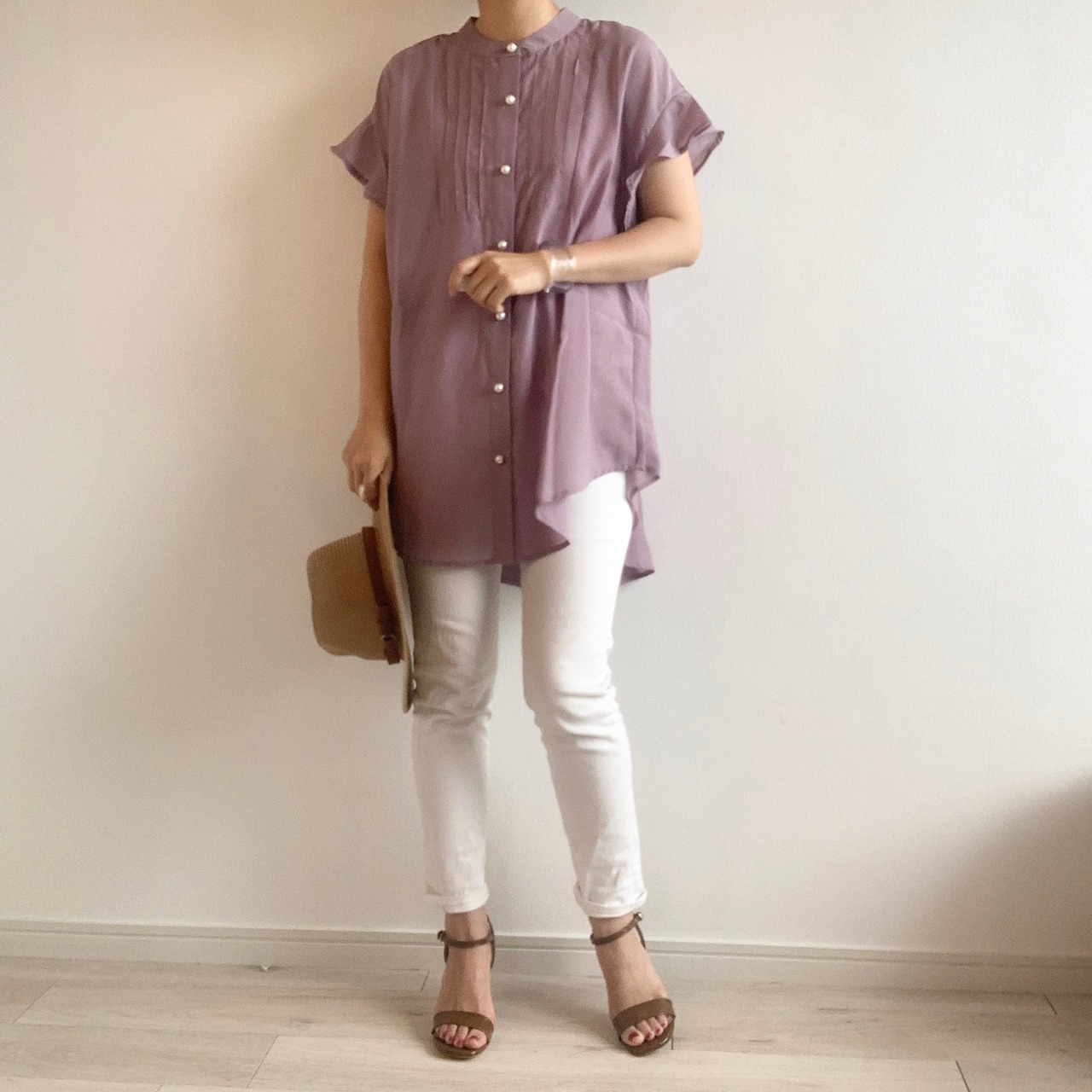 ふわりと軽い素材にフリル、そこにパールといった正統派ブラウス。ノースリーブが苦手な方も、この袖丈とフリルによって、二の腕をほっそりと見せられる効果があります。