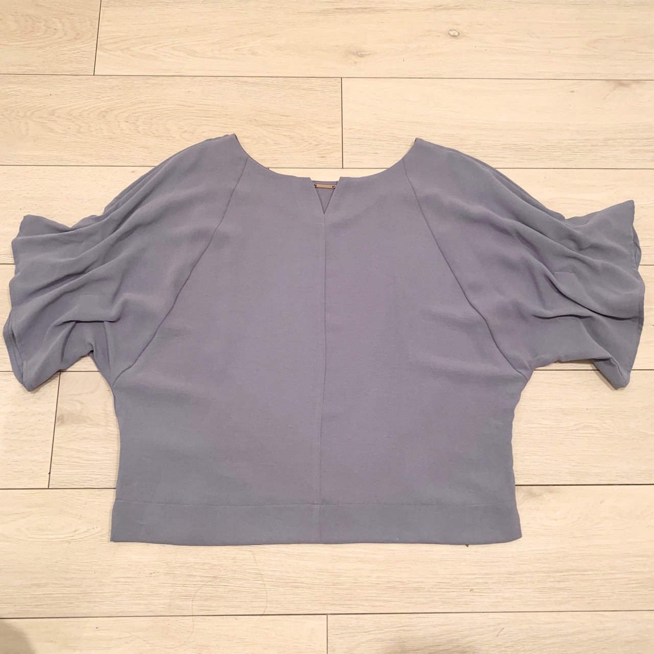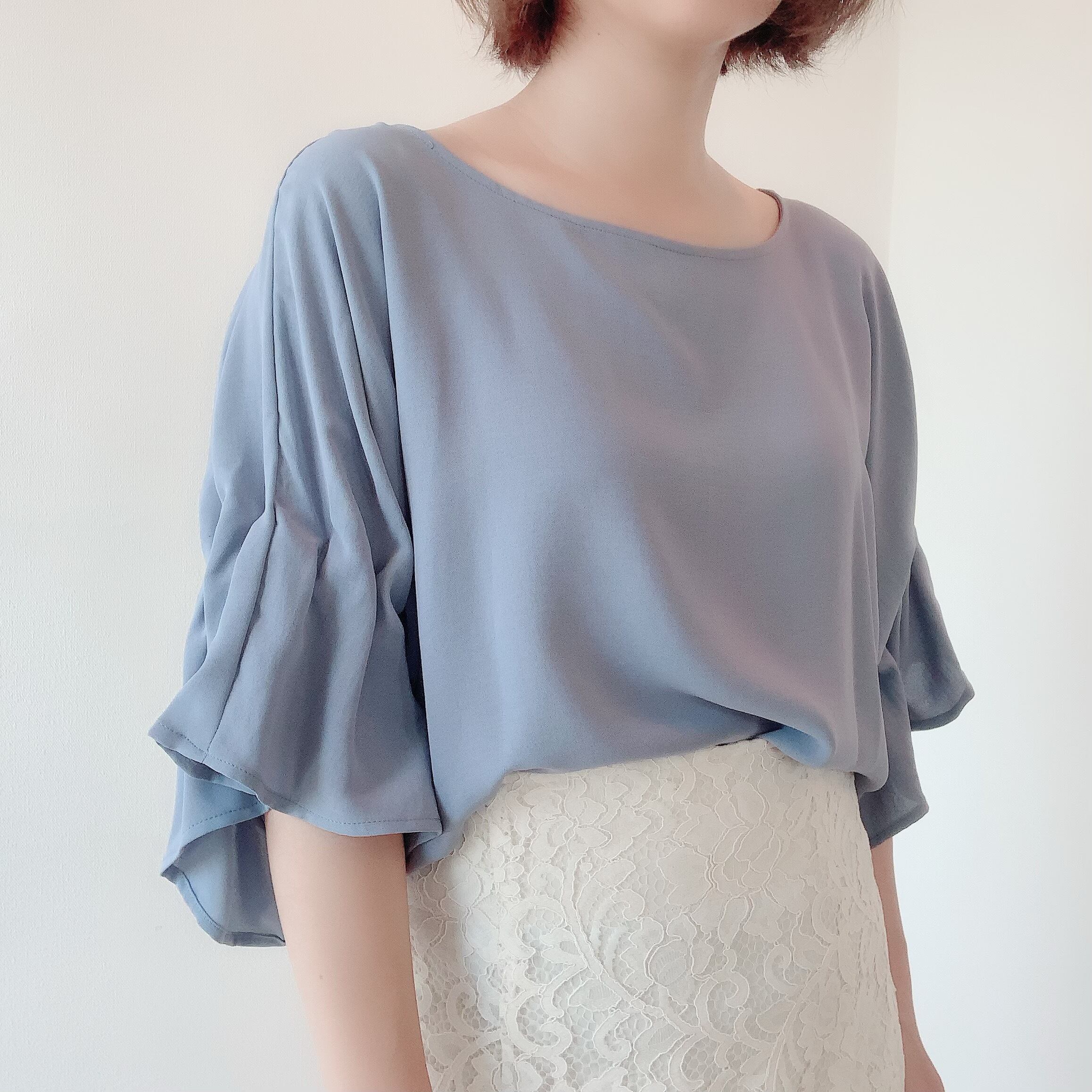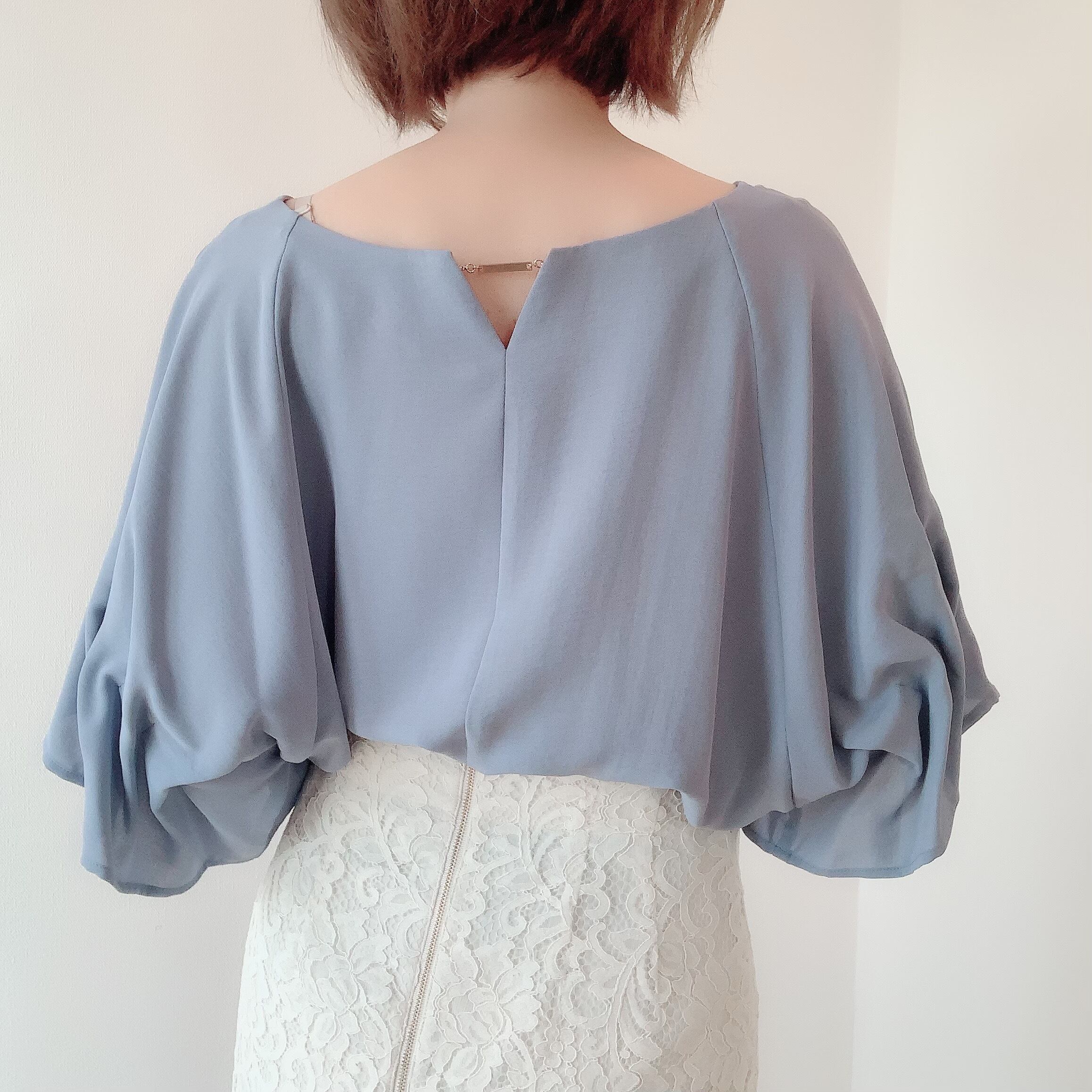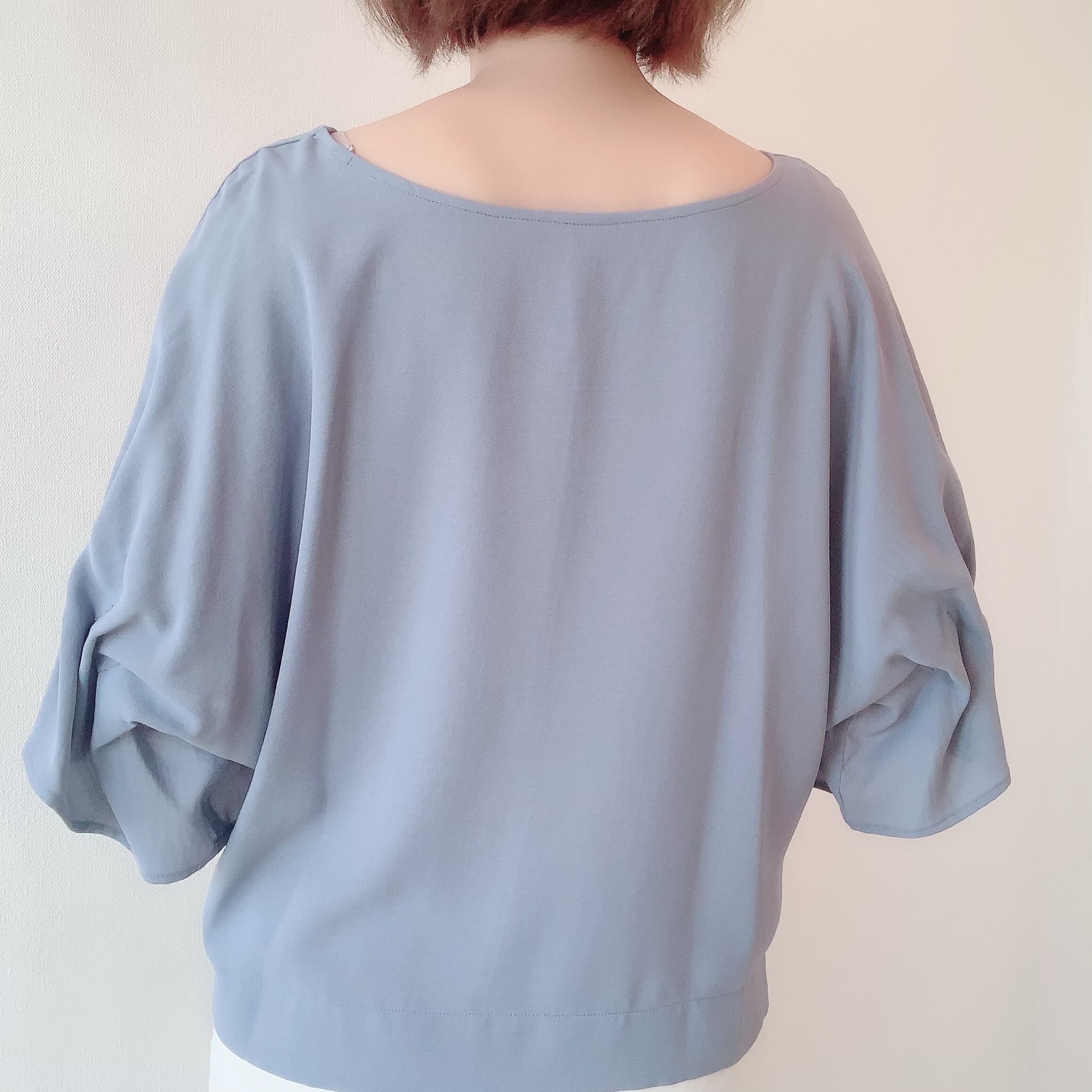 そで部分の贅沢なドレープは、裏側に太めのゴムを仕込んでハリを出しています。